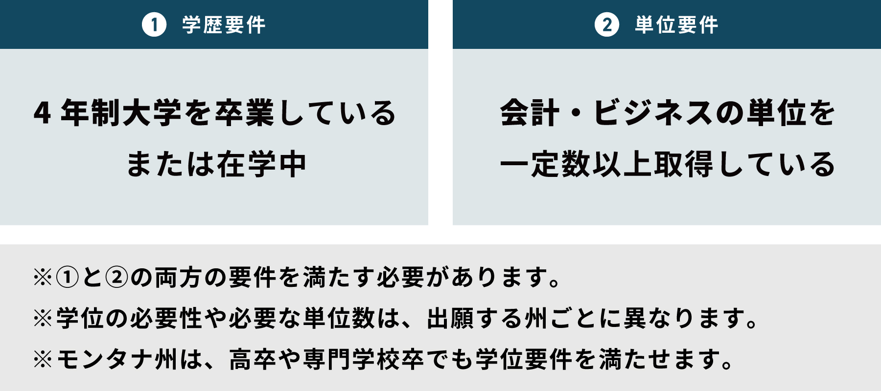 それぞれの州の受験資格については2章で詳しく丁寧に解説しますが、ここでは学歴と単位の2つの要件について簡単に解説していきます。