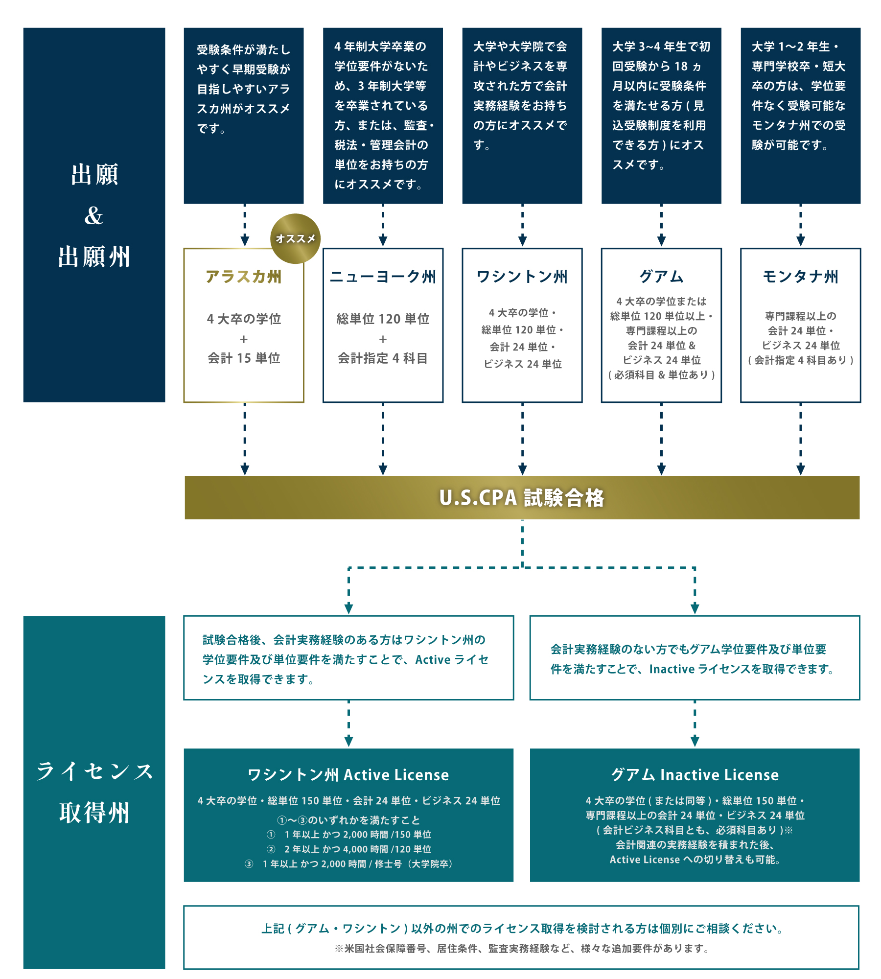 そのため、CPA会計学院では、アラスカ州で出願しUSCPA試験に合格後、比較的条件が緩いワシントン州やグアムでライセンスを取得するルートを推奨しています。