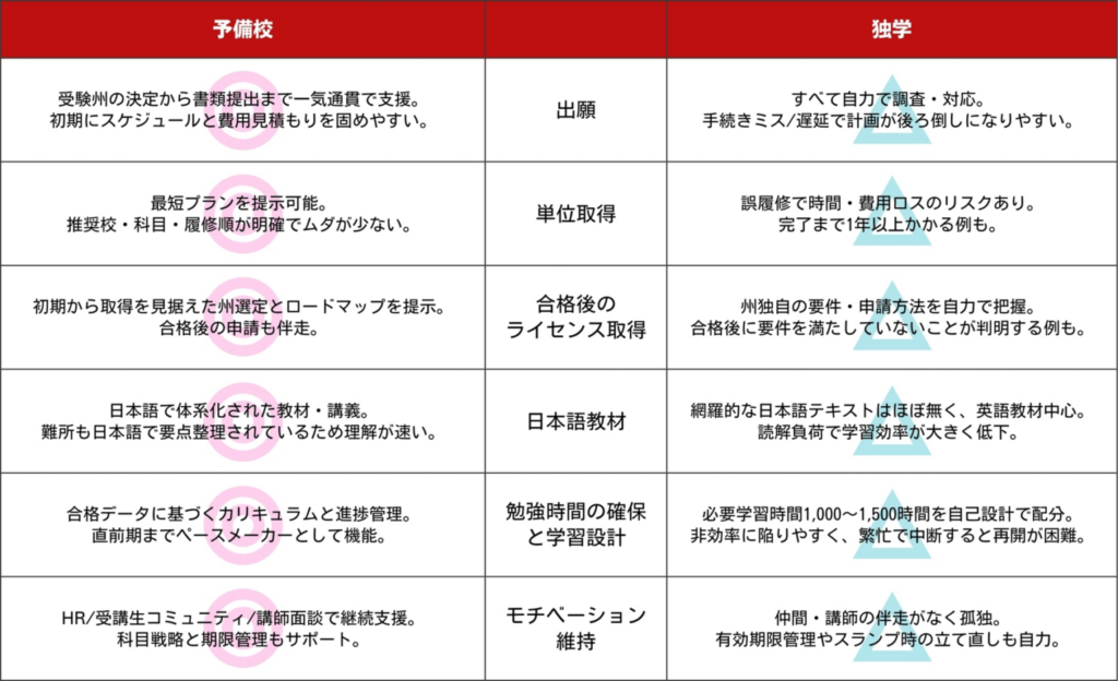 出願州は、合格後のライセンス取得要件も踏まえて選ぶ必要があります。しかし、独学で試験対策をしながら、合格後の手続きまで見据えて計画を立てるのは難しいのが実情です。