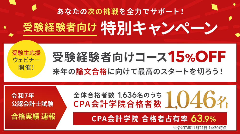 次回の試験合格に役立つ情報と特典が満載です。 この機会にぜひCPA会計学院のコースで合格を目指しましょう!