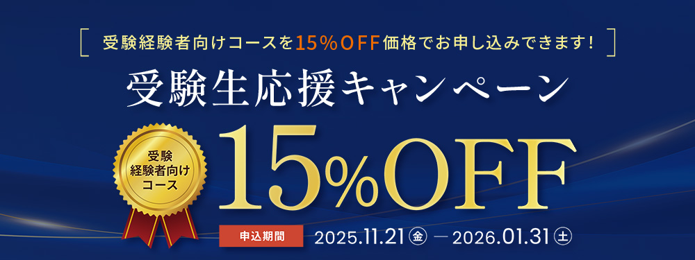 トップ講師によるオンラインセミナーや、受験経験者向けコース受講料が今だけ15%OFFのキャンペーン!