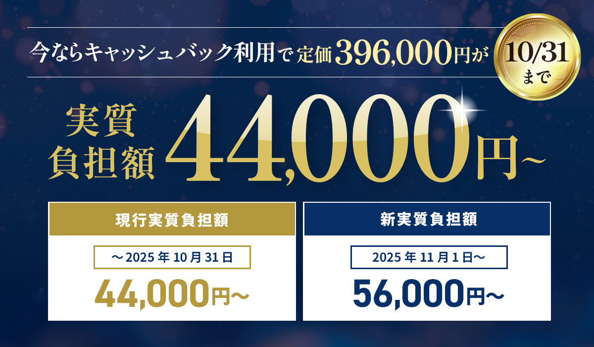 さらに、2つのキャッシュバックを利用すると最大352,000円(税込)が返還され、実質負担額は44,000円(税込)に!