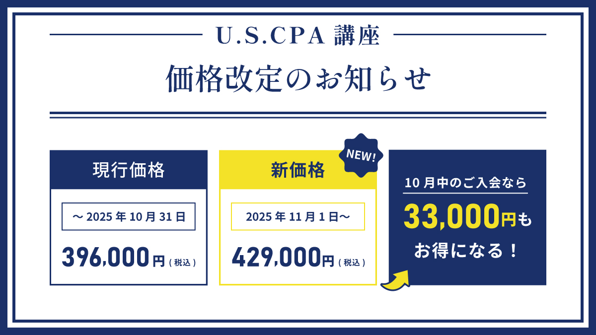 CPA会計学院では、USCPA講座を相場の約1/2である396,000円(税込)で提供しております。