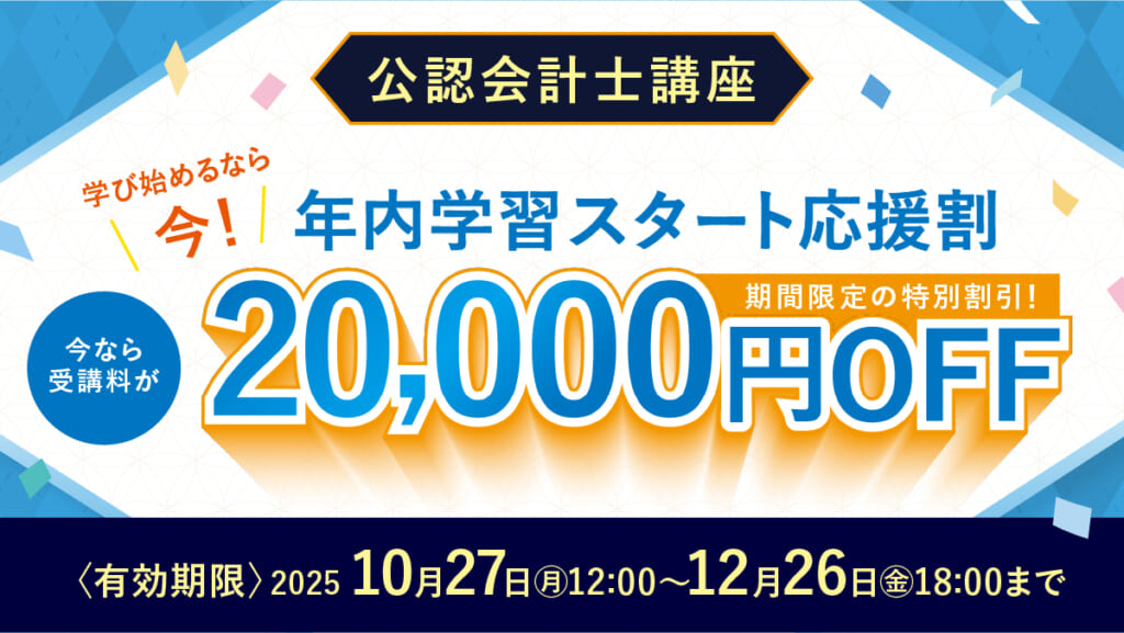 学び始めるなら今!公認会計士講座 年内学習スタート応援キャンペーン 今なら受講料20,000円OFF!!(25/12/26まで)