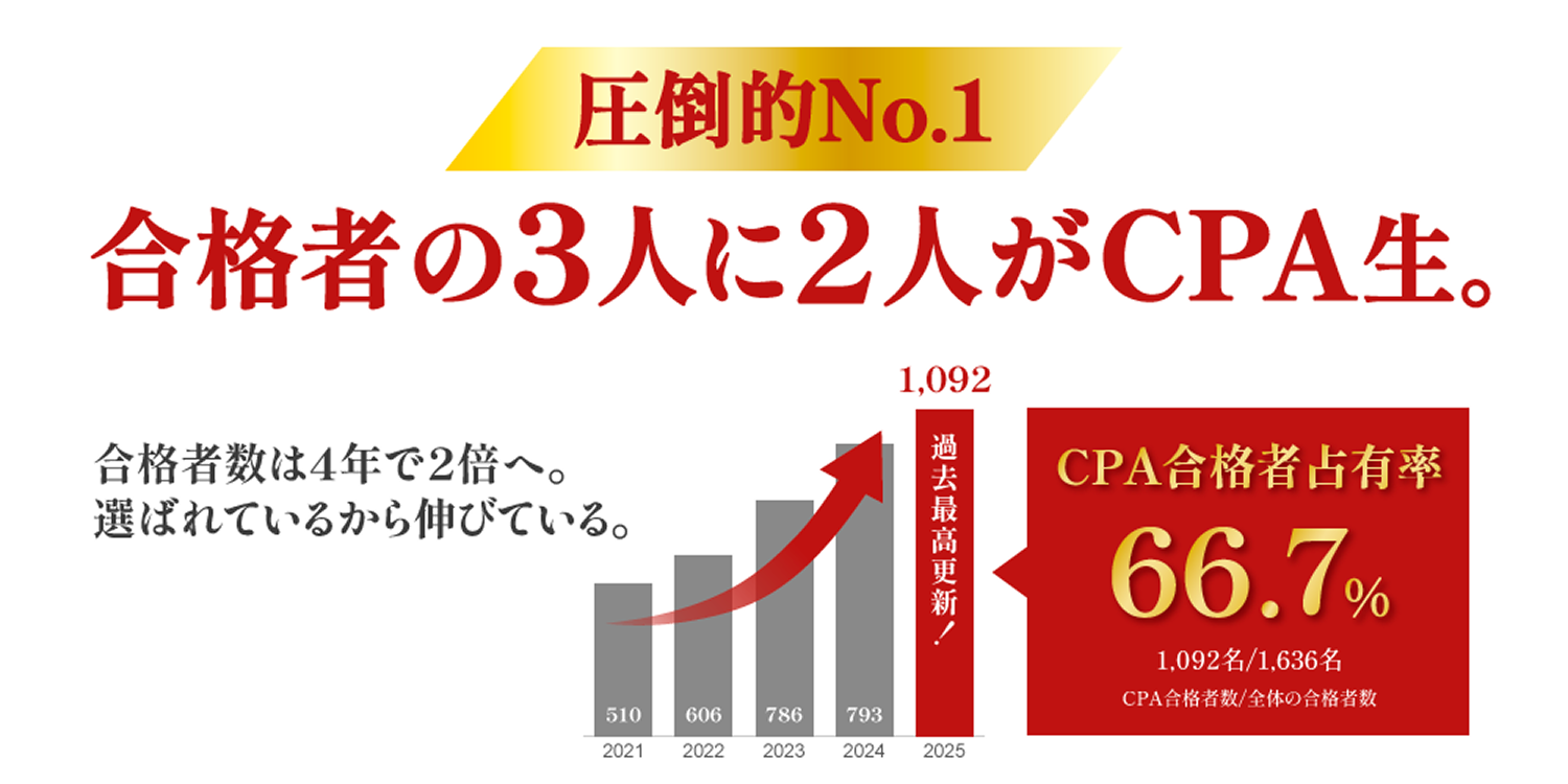 中でも「CPA会計学院」は公認会計士試験に特化した予備校として、個々の学習計画の策定から徹底した受講生サポートを提供しています。その成果として、2025年の公認会計士試験では、全体の合格者1,636名のうち1,092名がCPA会計学院の受講生であり、合格者占有率66.7%という圧倒的な合格実績を誇っています。