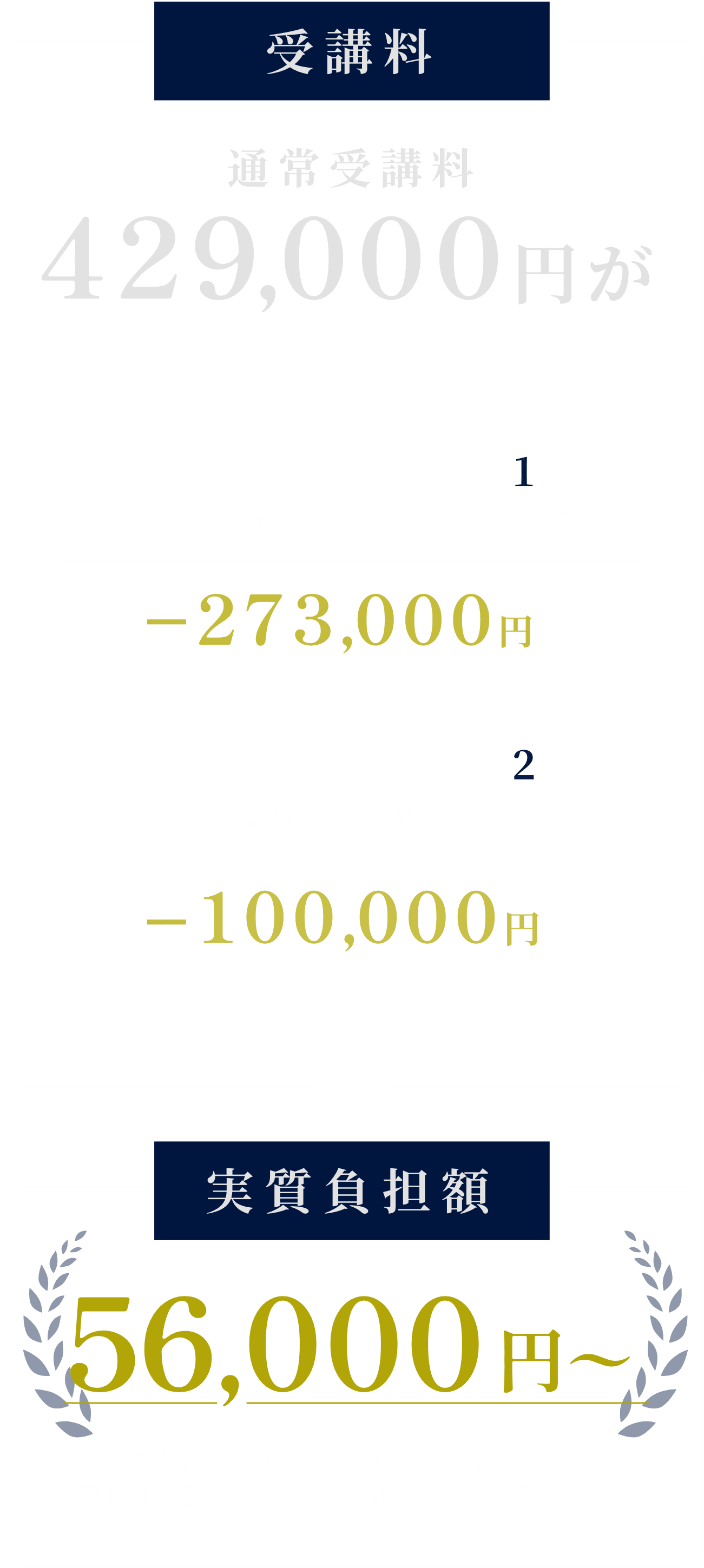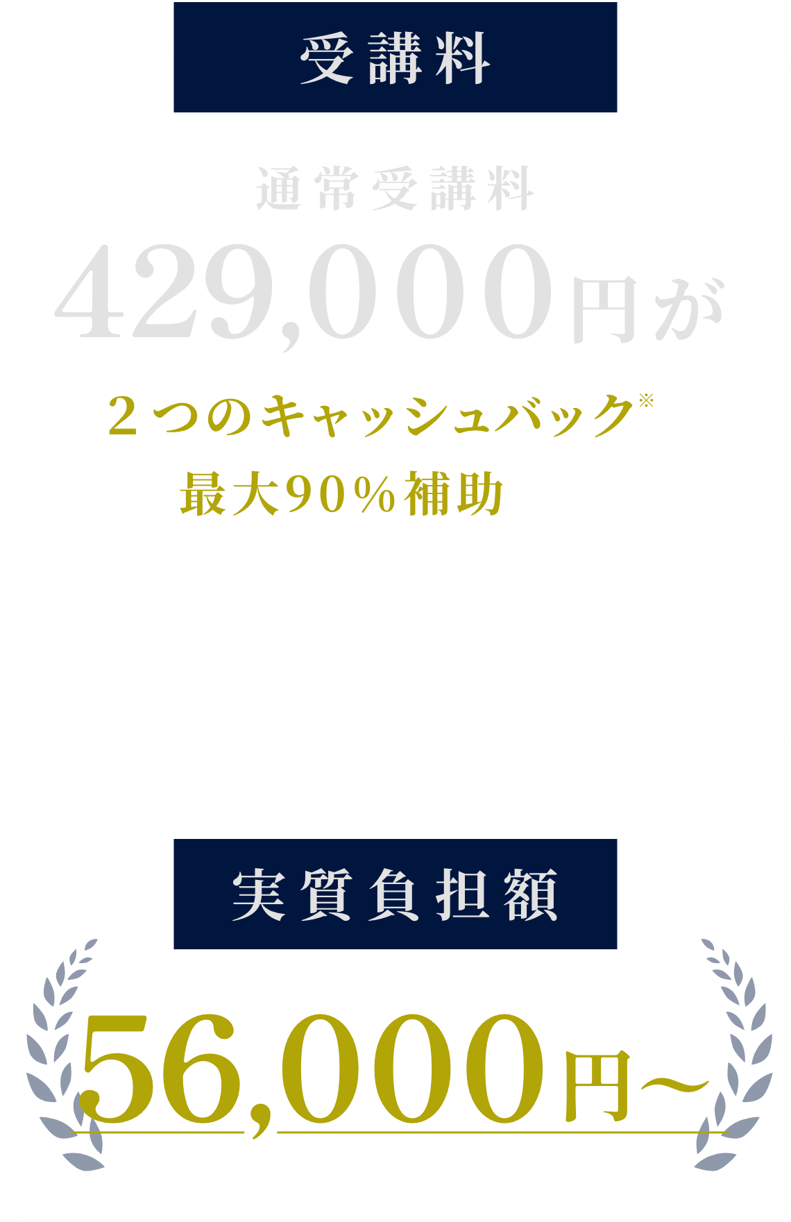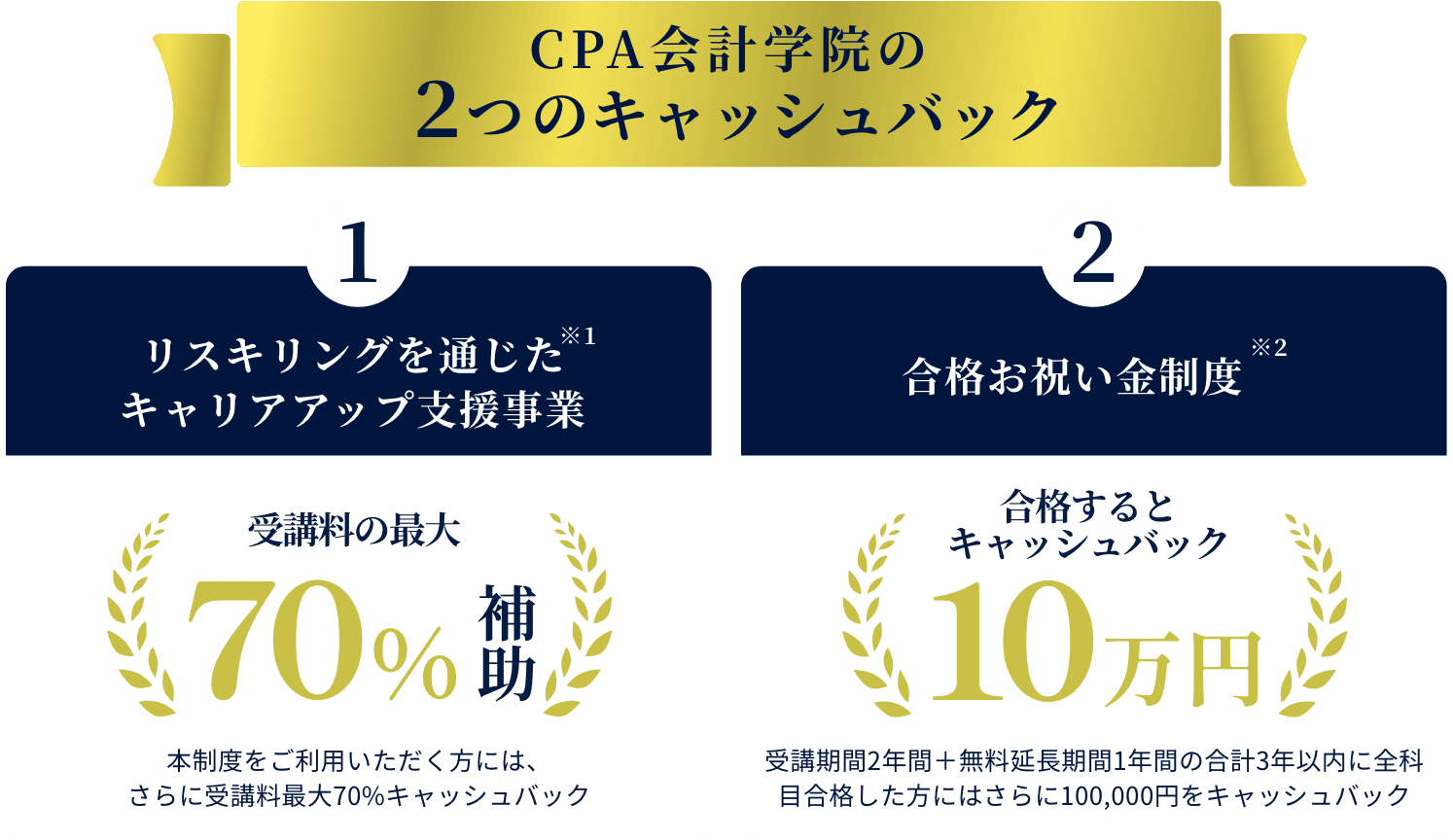 本講座修了時に受講料の50%を返還、転職して1年経過時に20%を返還 - ※2 合格お祝い金制度