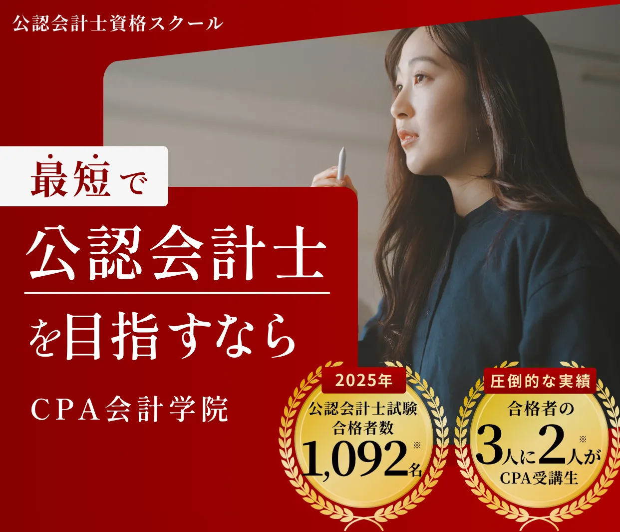 - ※1 令和7年公認会計士試験合格者1,636名(※2)に占めるCPA会計学院公認会計士試験合格者1,092名(※3)の割合で算出をしています。