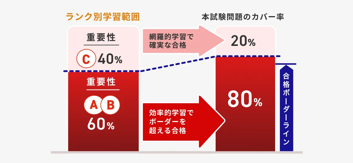 すべての論点に対して、試験に出題される可能性が高いと思われる順に、A・B・Cのランク付けをしているので、仕事や学業で忙しい方でも効率的な学習が可能です。
