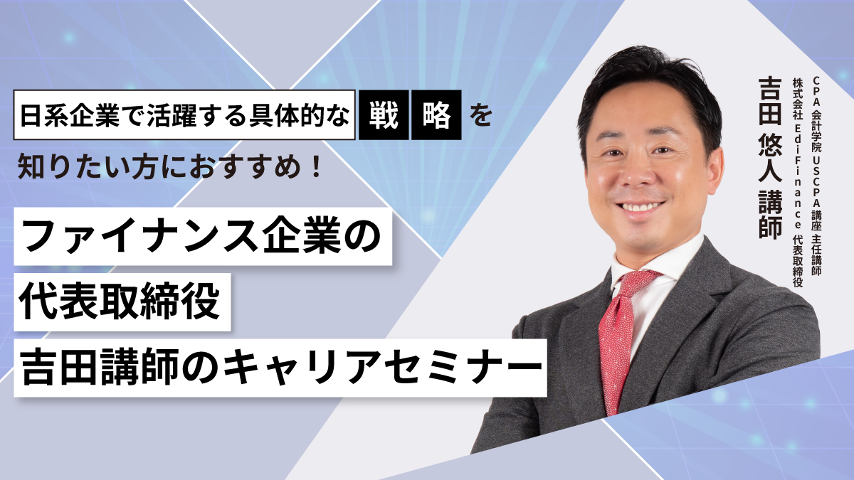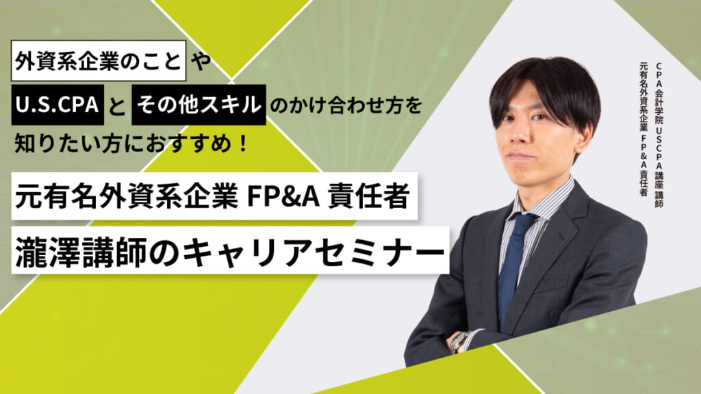某有名外資系企業のFP&A責任者を務めたCPA会計学院のUSCPA講座の講師が、実体験から、会計・財務未経験者でもUSCPA資格を活かして多彩な業種や職種へ挑戦する方法を伝授します。