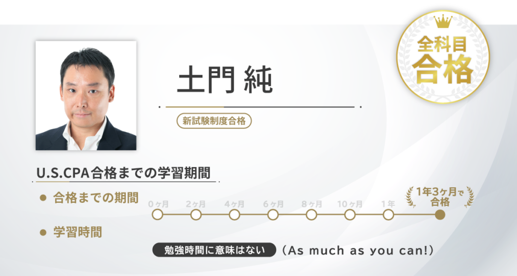 私は日本の公認会計士として大手監査法人にて勤務しています。監査法人のアルムナイで出会った国内外のUSCPAの方々がとても優秀で刺激を受け、自分もUSCPAのタイトルホルダーになりたいなと思い学習を開始しました。