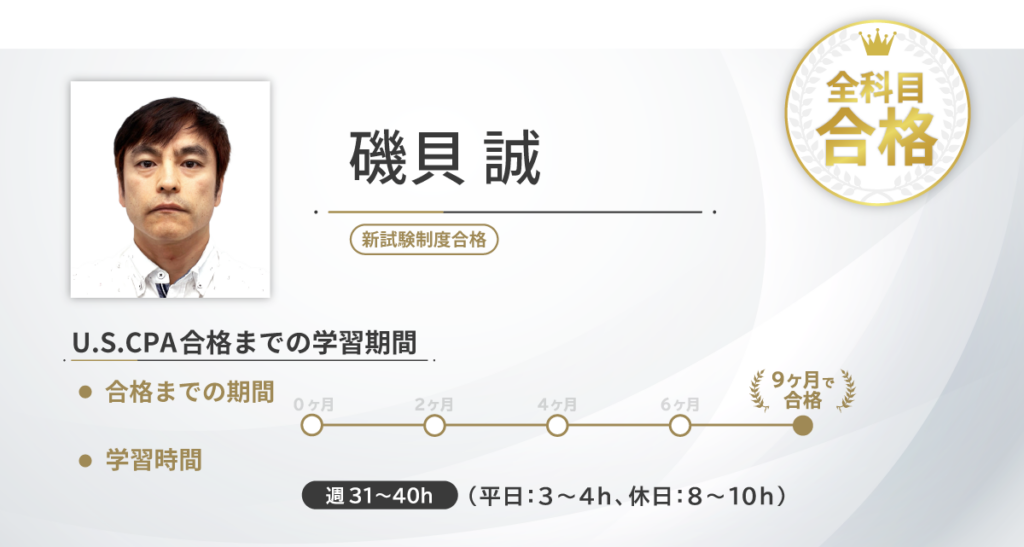 2024年10月に学習を開始し、2025年2月にFAR、4月にBAR、6月にAUD、8月にREGに合格し、10ヶ月でUSCPA全4科目合格を達成しました。