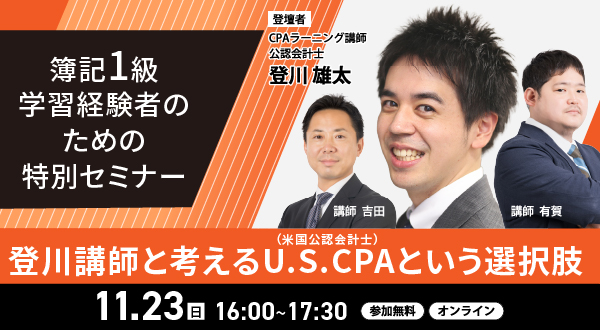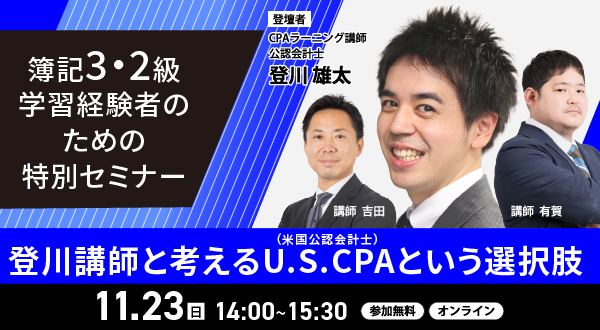 イベント・セミナー一覧 定期開催セミナー一覧 特別セミナー一覧 定期開催セミナー一覧 特別セミナー一覧 USCPAの合格を目指すならCPA会計学院 万全なサポート体制で合格へと導きます! 無料の体験講義つき 資料請求 初学者の方向け 説明会を予約する 疑問・不安を個別に解決 個別相談を予約する